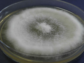 A análise macroscópica revela colónias branco-acinzentadas de reverso amarelo-ocre, o crescimento é rápido acabando por preencher a placa de petri, e de textura lanosa.