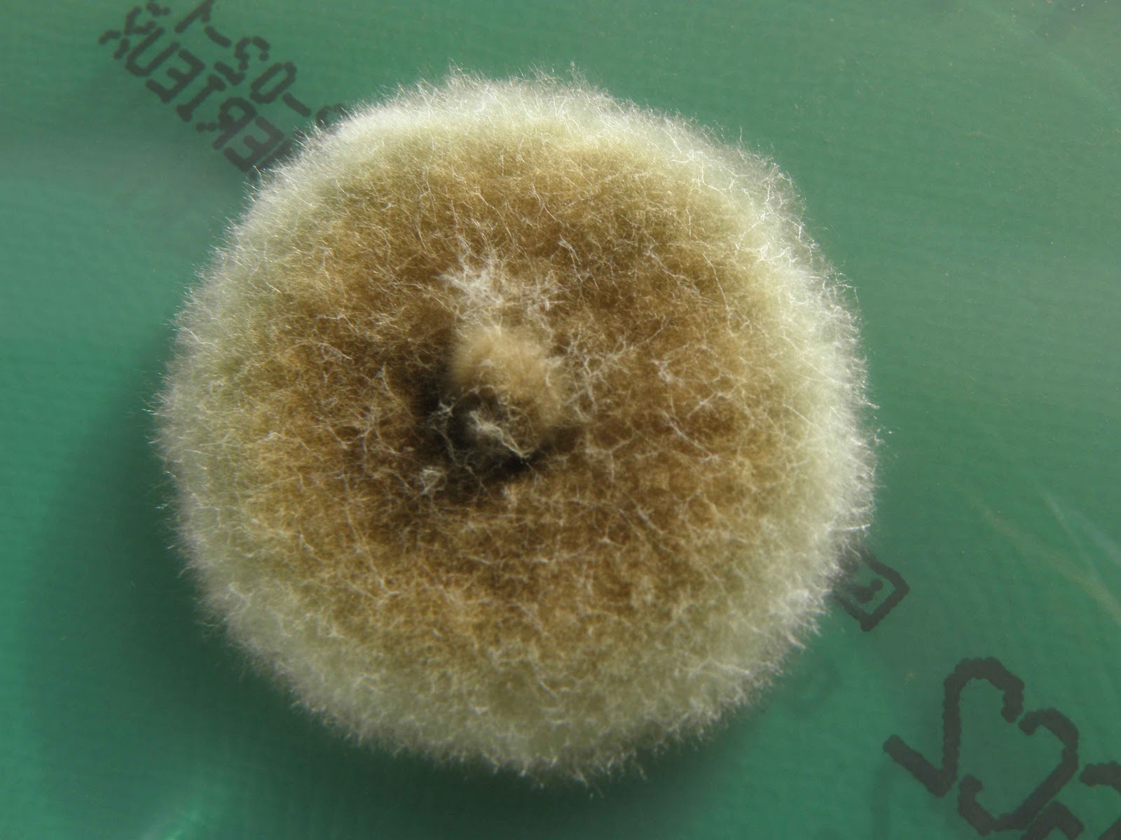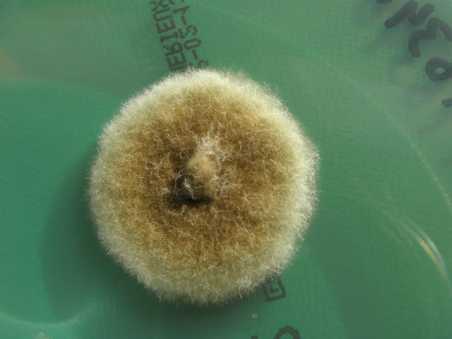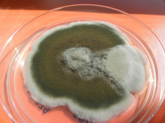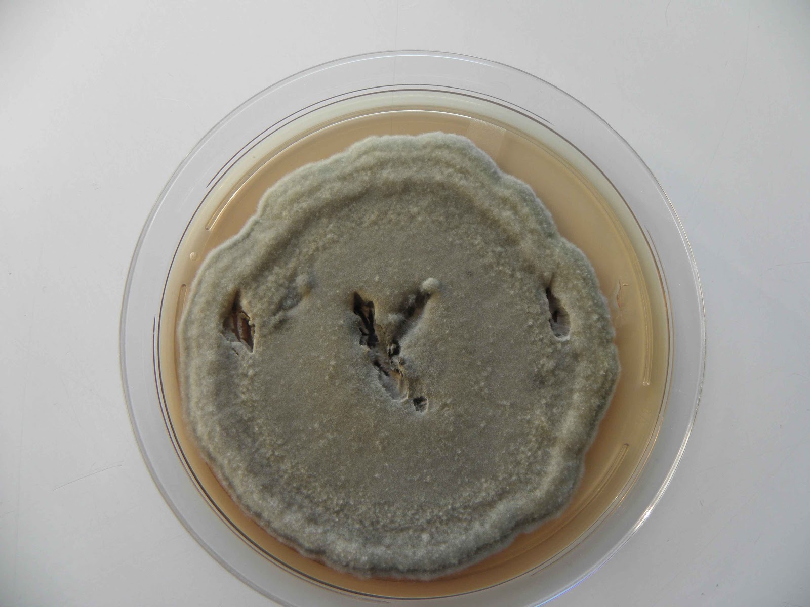 | A cor da colónia varia de cinzento a preto-azeitona. Nesta repicagem obteve-se uma colónia cinzenta. |