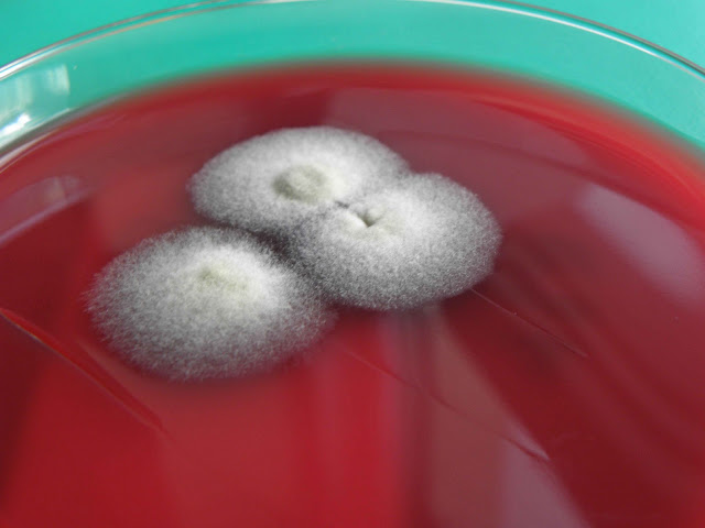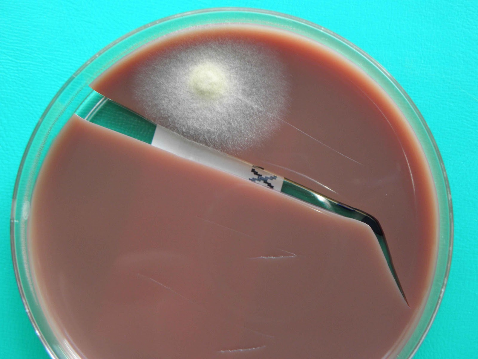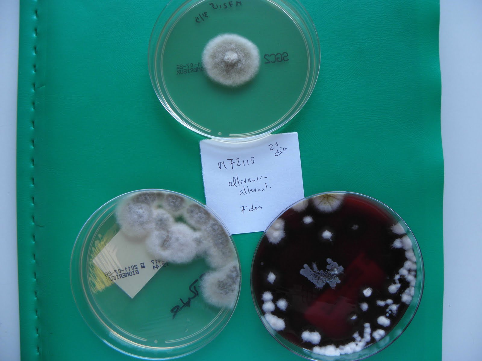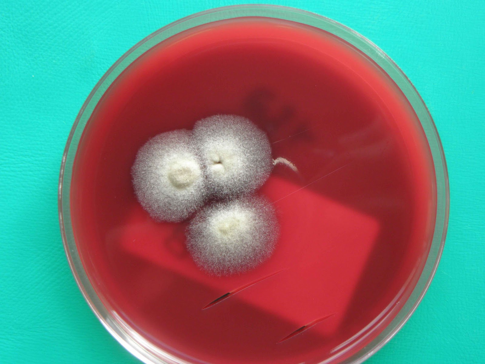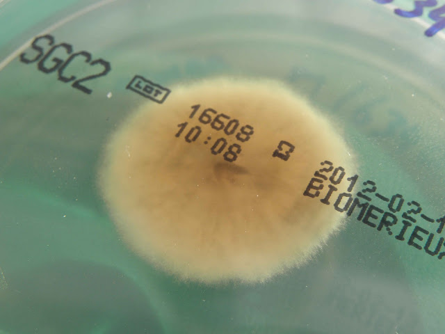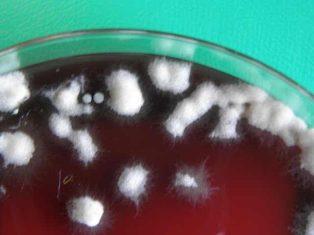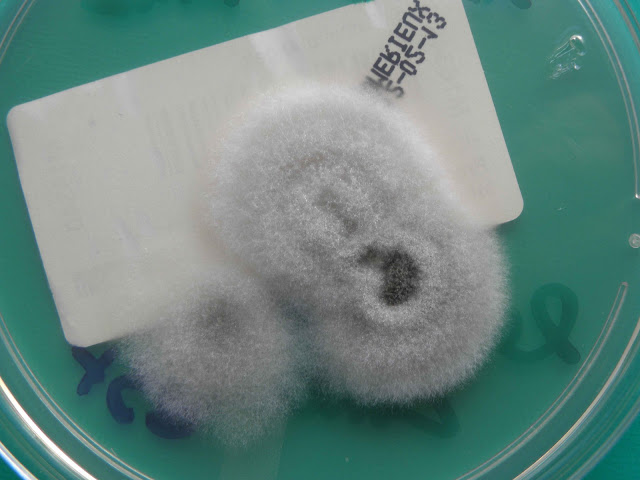 | Sementeira feita à cabeceira do doente - gelose sangue. Três colónias de Alternaria alternata. |