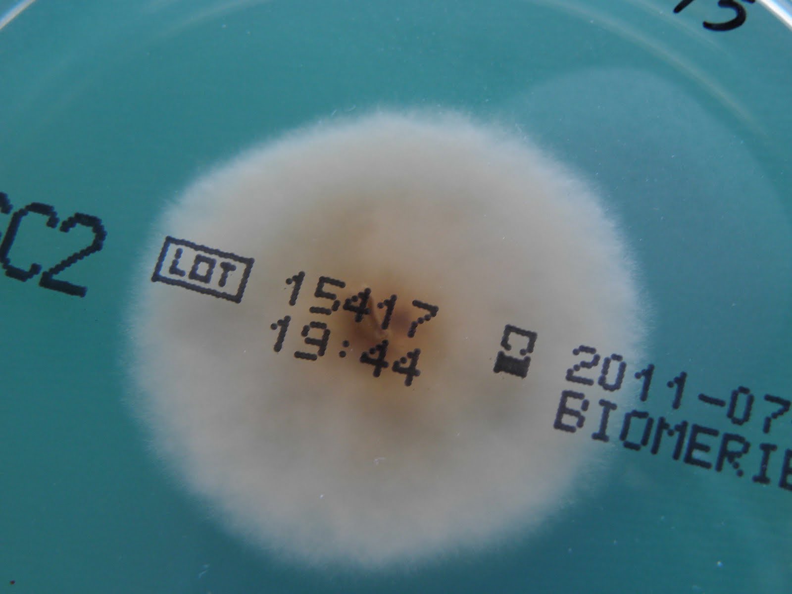 | A cor da colónia, nesta repicagem posterior, é verde/oliva. A cor pode variar com a fase evolutiva da colónia no tempo mas também com as características fisicas do meio, nomeadamente o pH. |