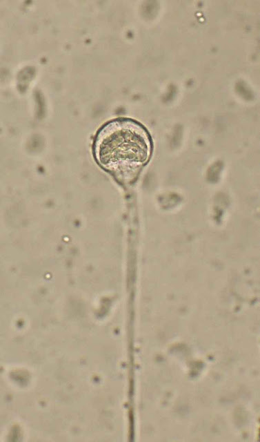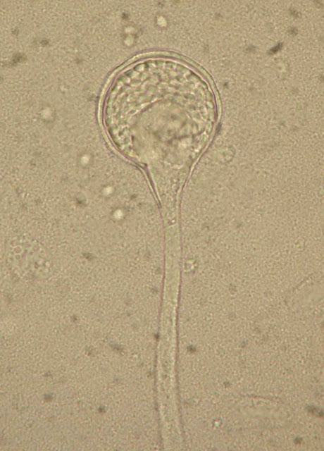 | Sporangium hialino, não ramificado (ou raramente) e piriforme. |