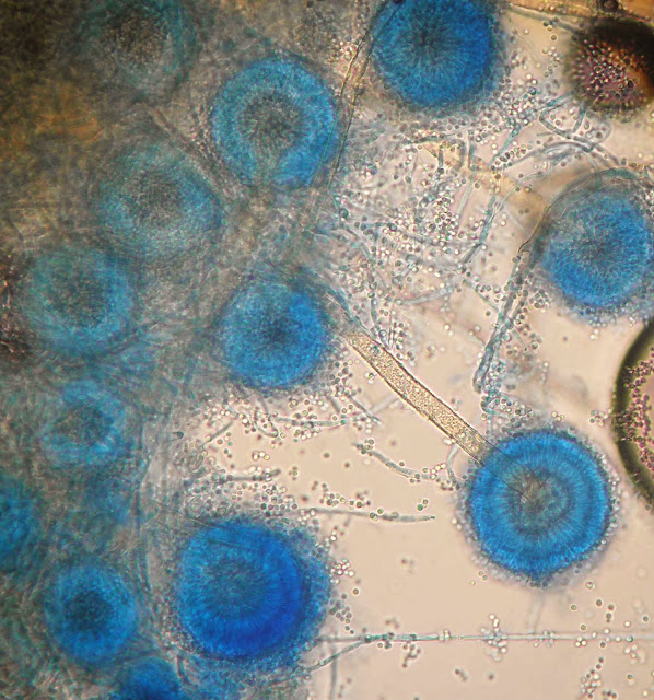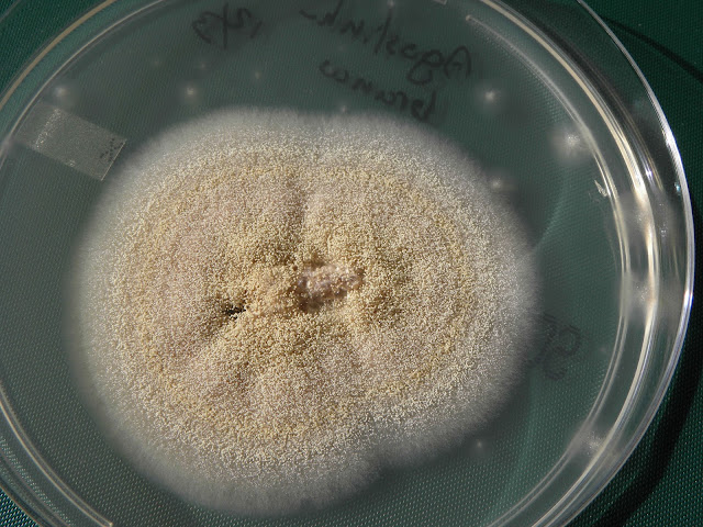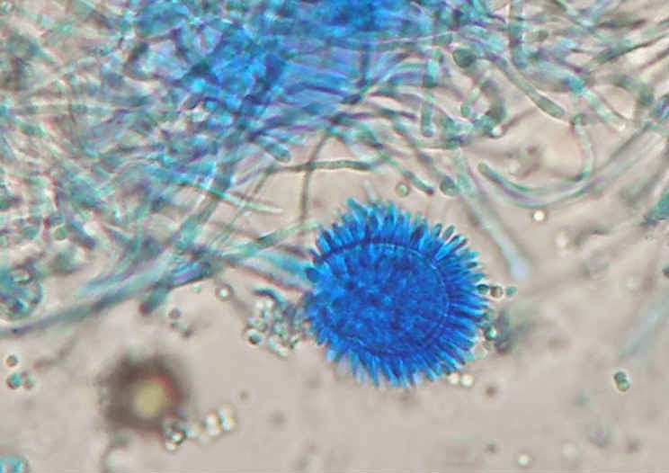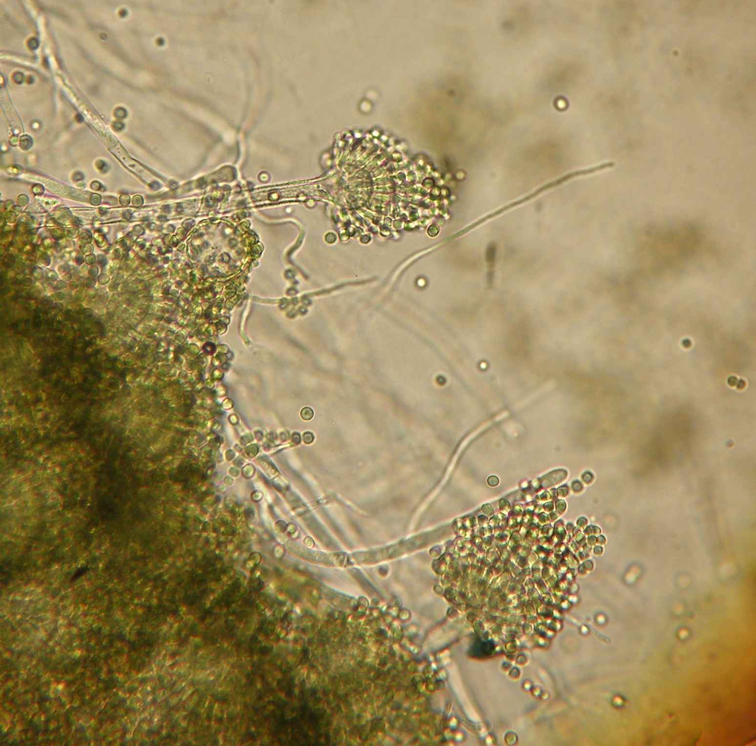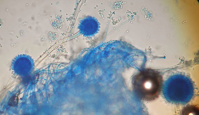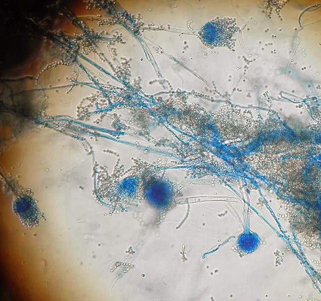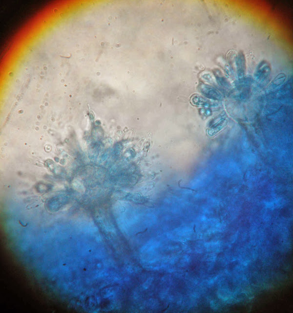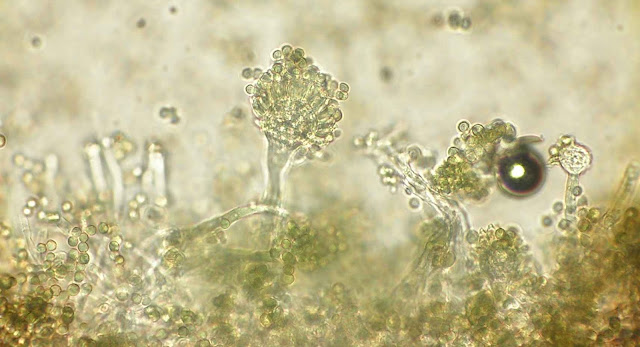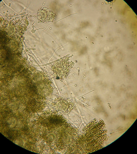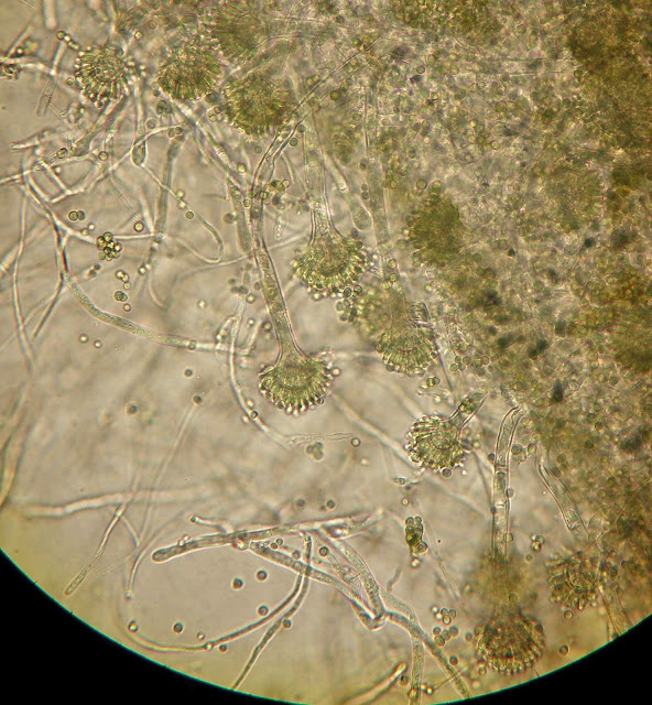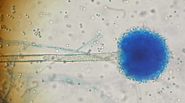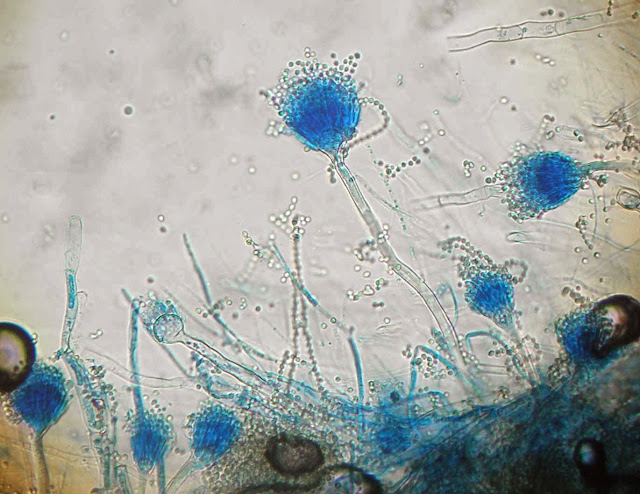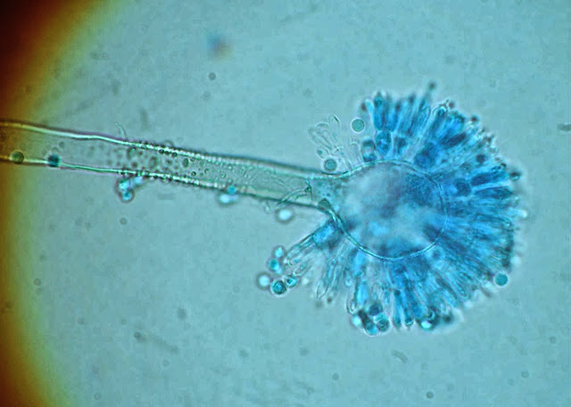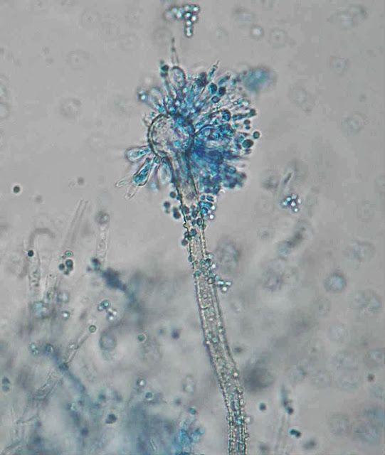 Ao exame microscópico apresenta cabeças conidiógenas esféricas, bi-seriadas sendo as vesiculas cobertas em toda a circunferência pelas métulas. A haste do conidióforo é acastanhada e rugosa.
