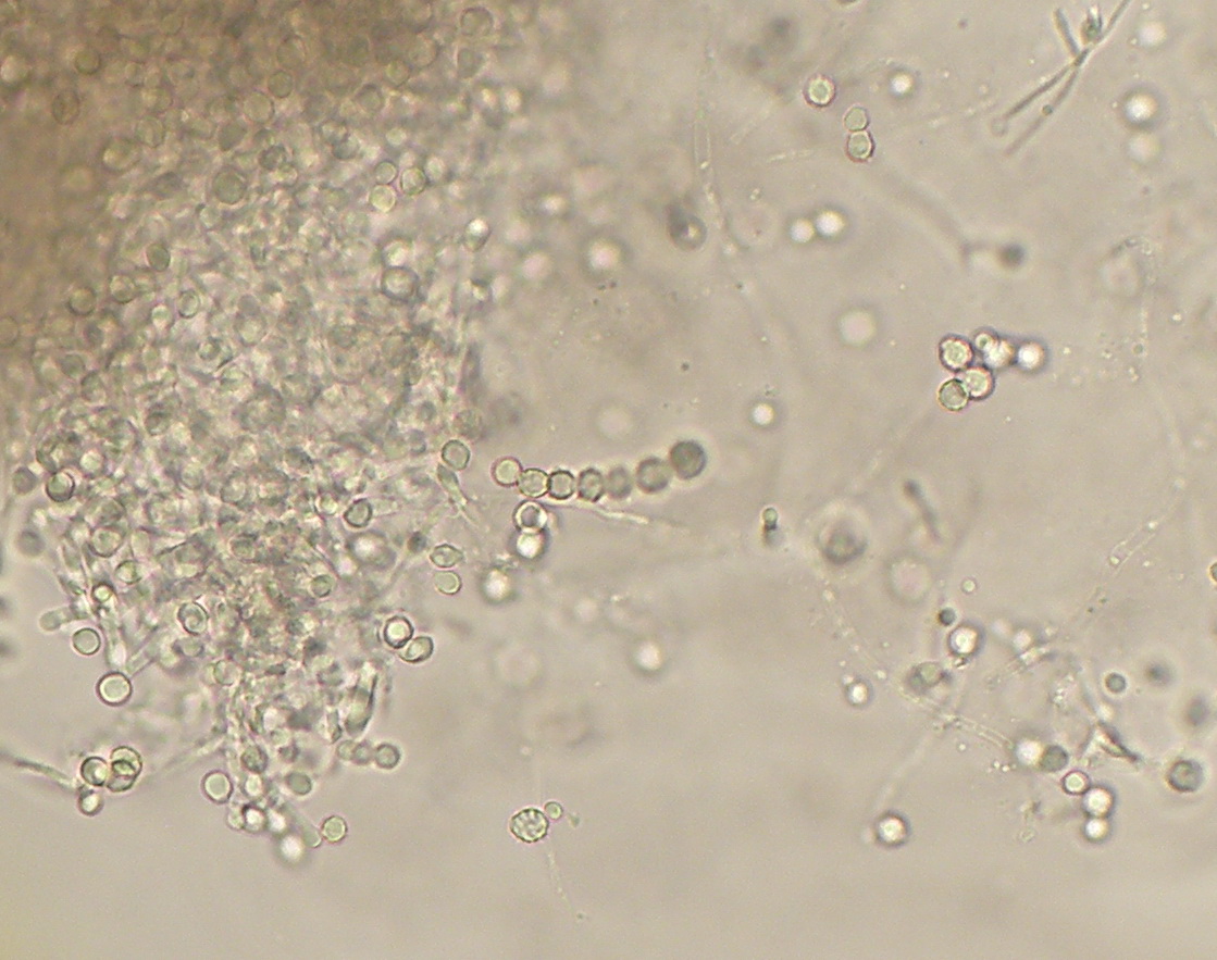 | Células conidiogenas simples ou agrupadas em pincel. Conideos de parede rugosa frequentemente em cadeia. |