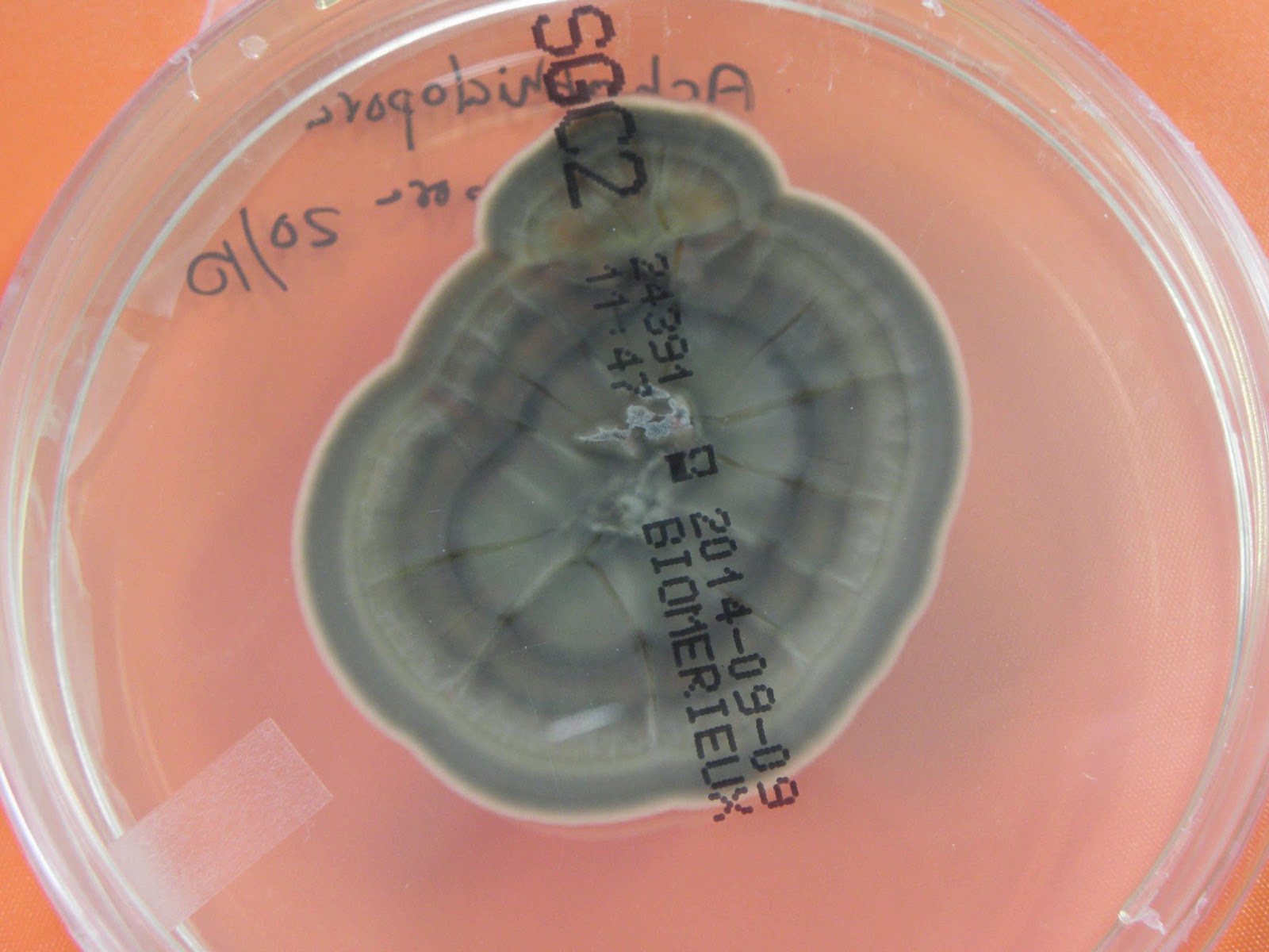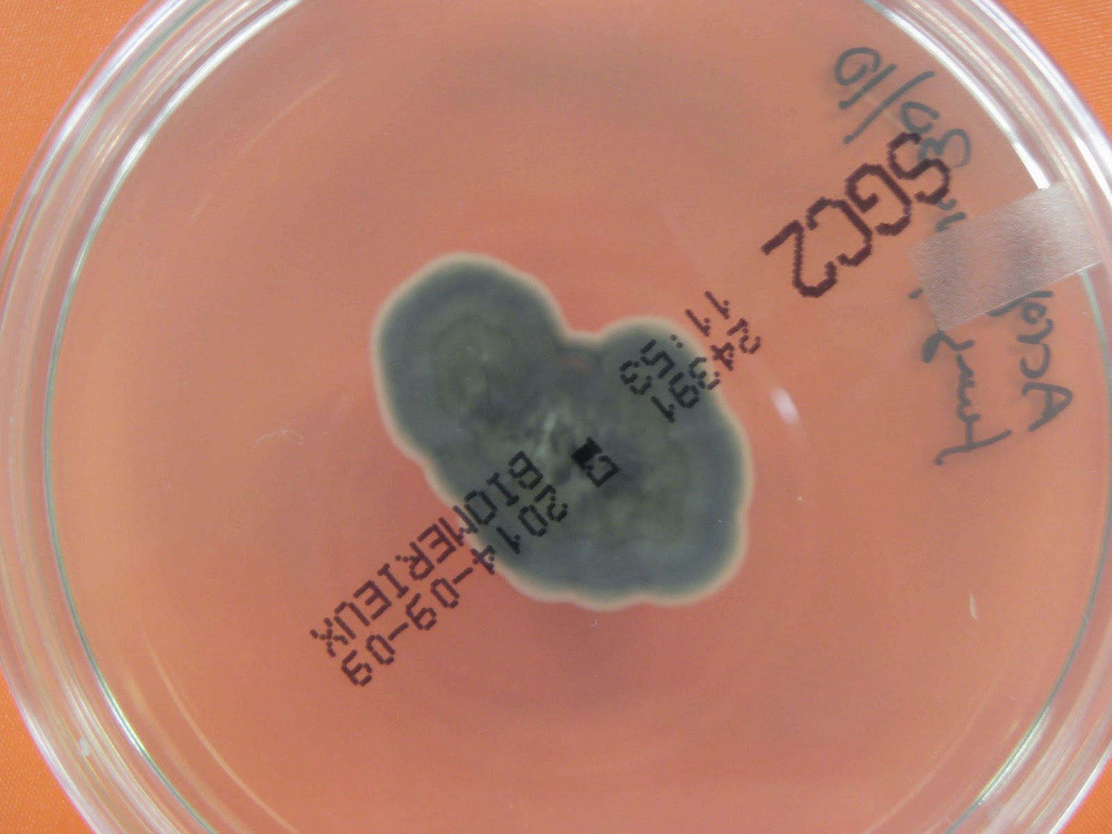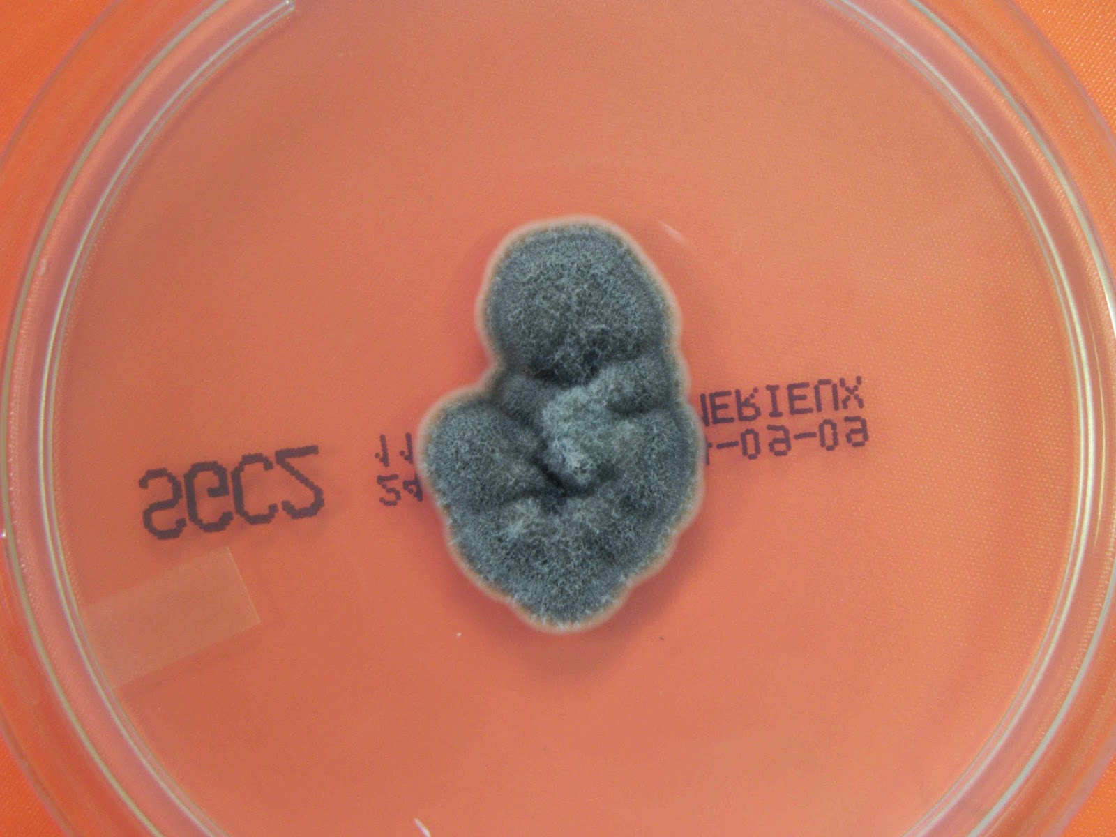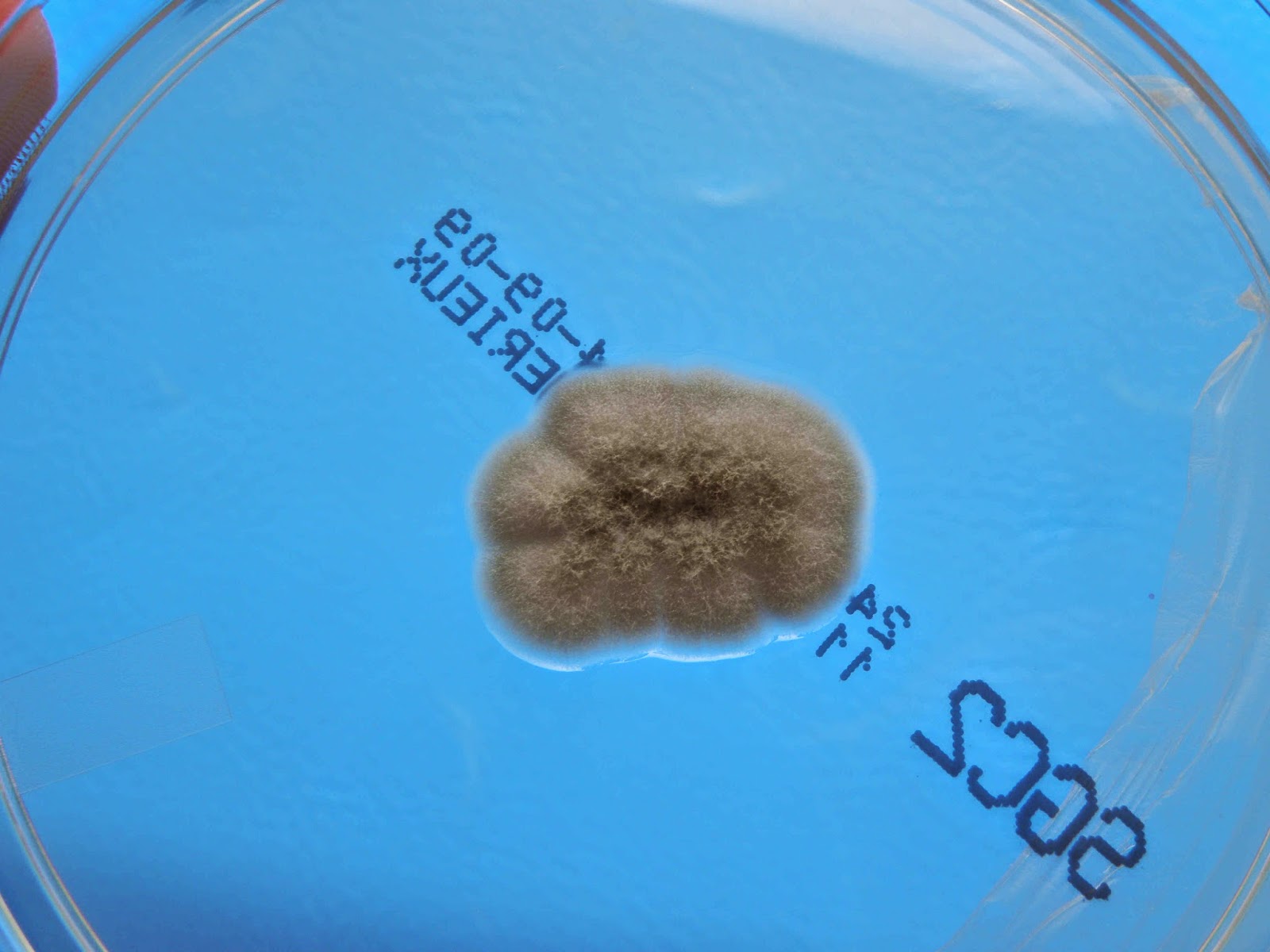 Ao exame macroscópico as colónias são de crescimento rápido, a cor é cinzento-acastanhada com reverso preto.