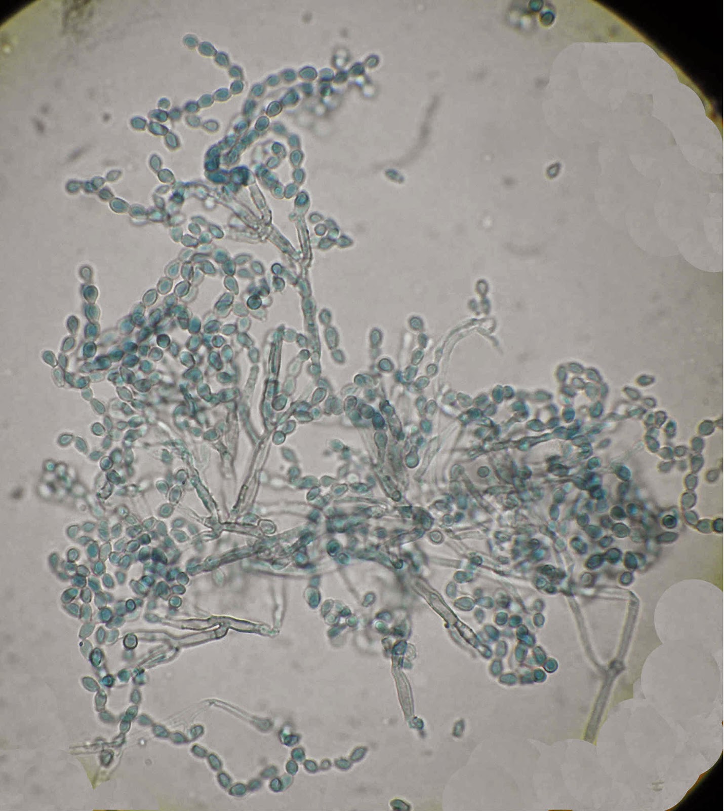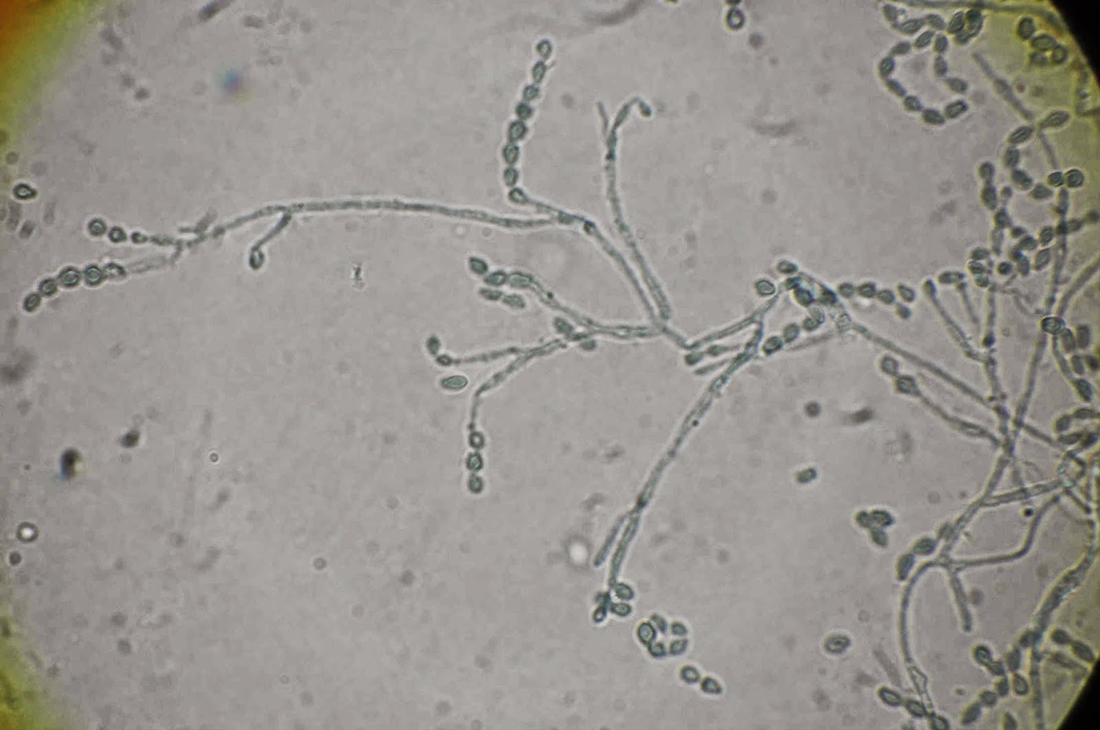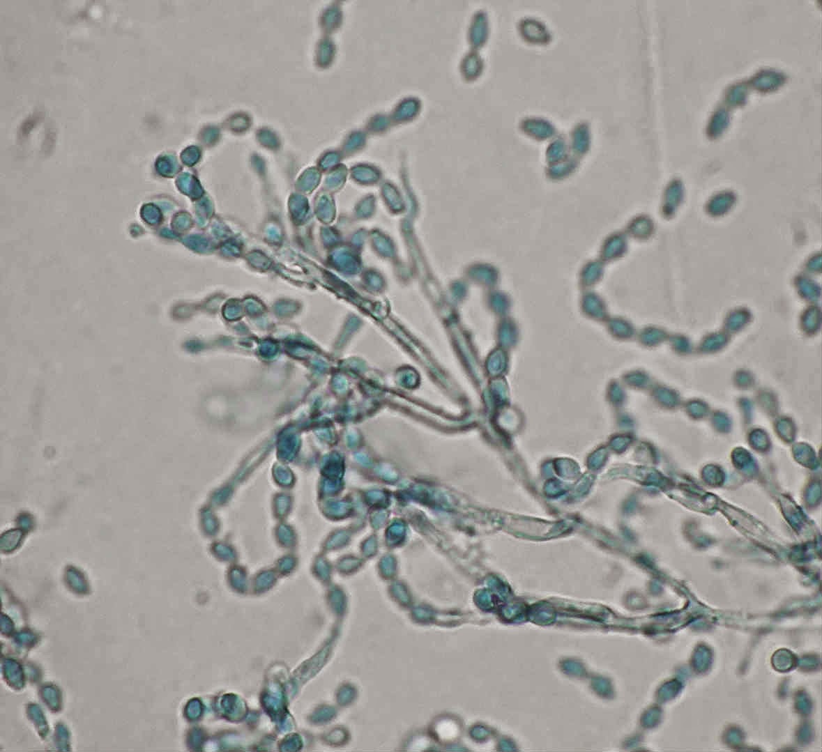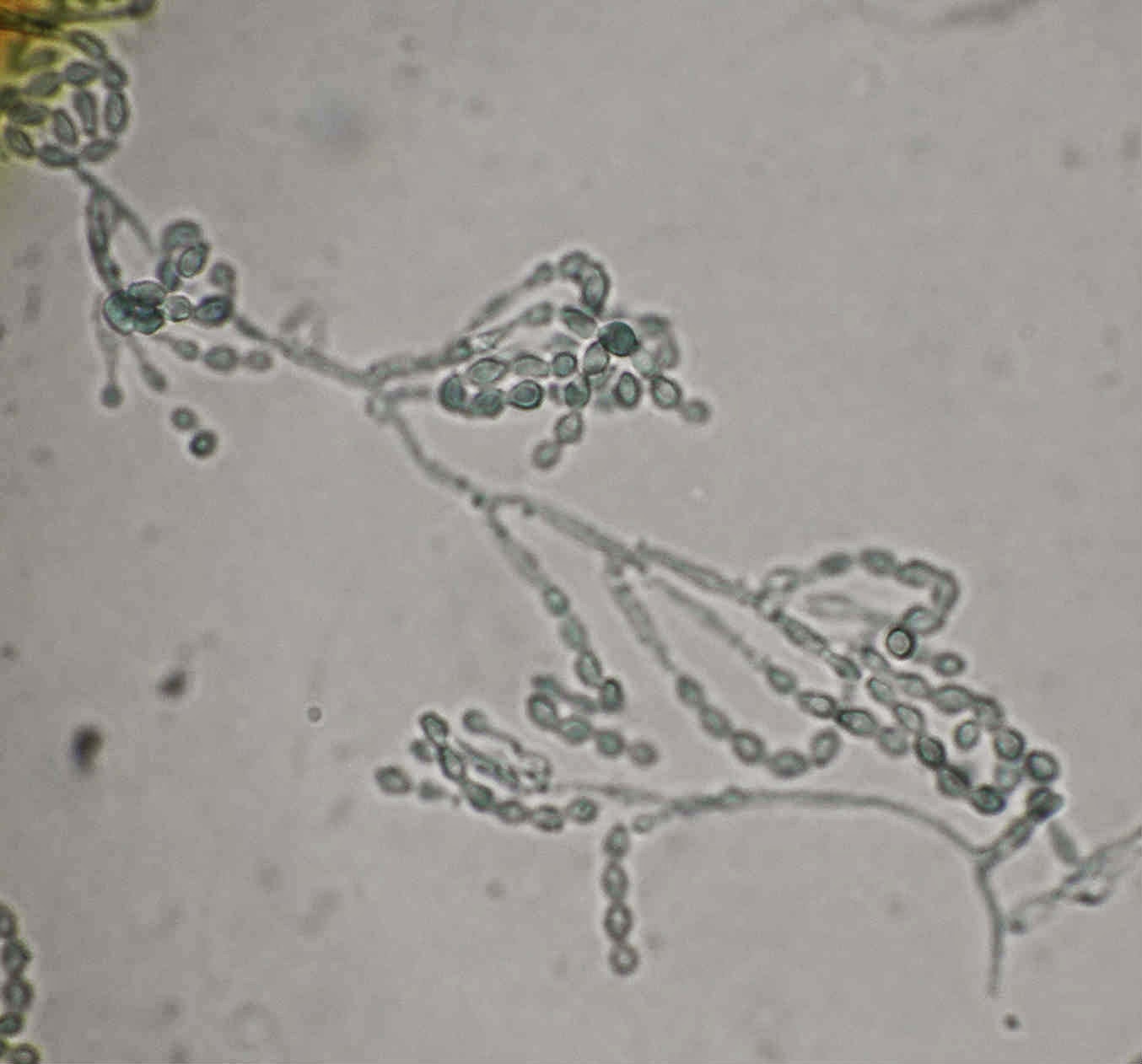 Ao exame microscópico os conidióforos nascem, de modo isolado, directamente da hifa quer lateralmente quer na sua porção terminal. Os conidióforos são erectos ou um pouco curvos afunilando em direcção ao apex. No topo dos conidióforos originam-se espirais de fiálides, cada fiálide termina num longo e estreito pescoço dando origem a longas cadeias de conideos castanhos com a forma de limão.