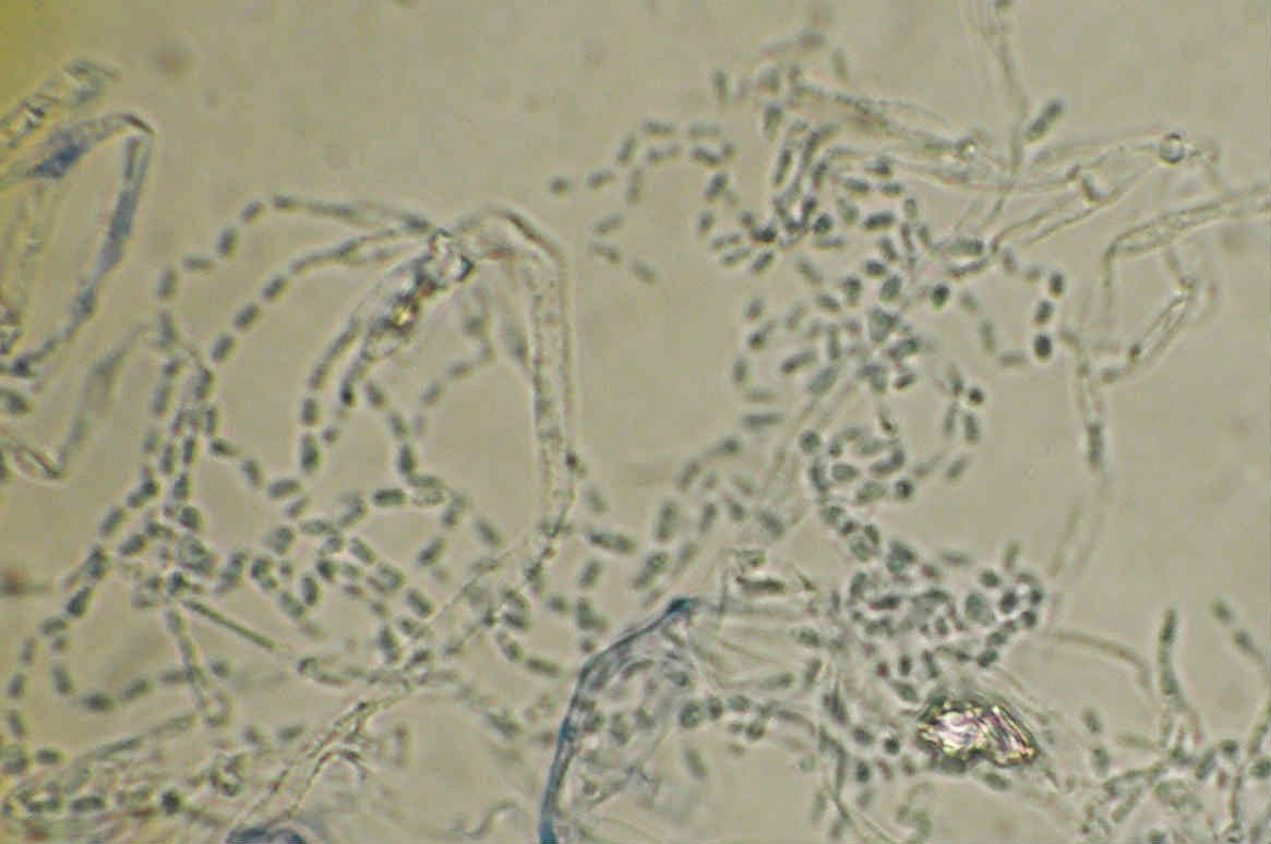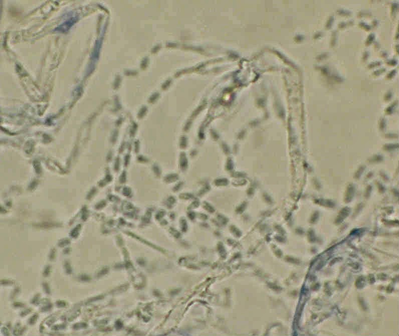 Ao exame microscópico este fungo faz lembrar o Penicillium com os conidioforos assimetricamente verticilados, mas os conideos são cilindricos e não são verdes, dispondo-se em longas cadeias colunares (no Penicillium os conidieos são redondos, ovais ou elipsoides).