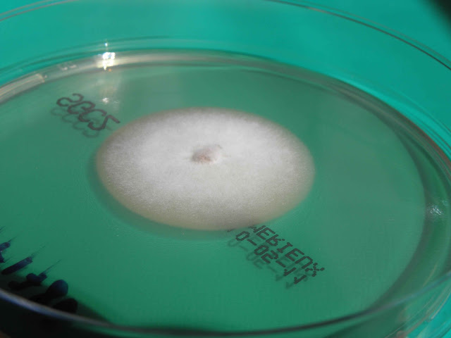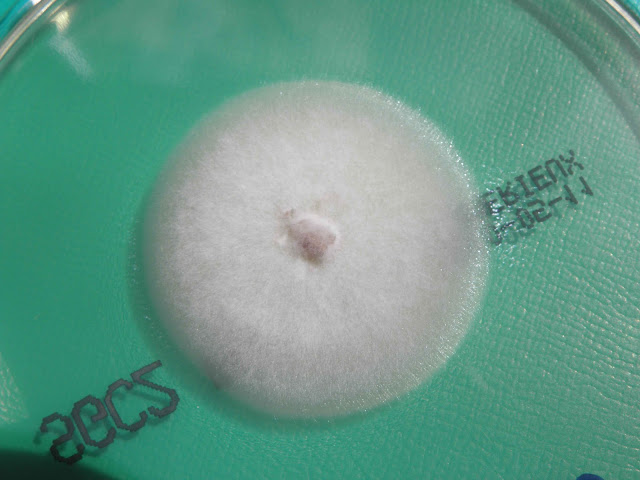 A microscopia da estirpe, cultivada, revela raros microconidios e ainda mais raros macroconidios, contudo os clamidosporos terminais (mamilonados no seu apex) e intercalares são muito frequentes; podem observar-se, ainda, hifas pectinadas e hifas em raquete (segmentos de hifa mais largas na extremidade).