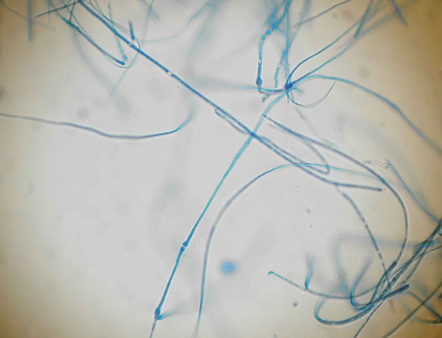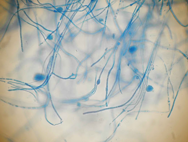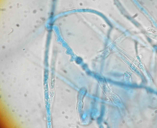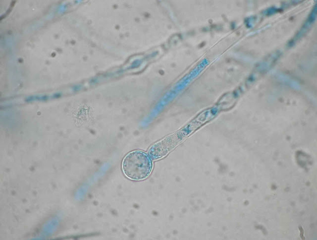 | Hifas em raquete e clamidosporos. |