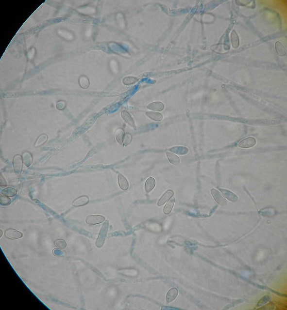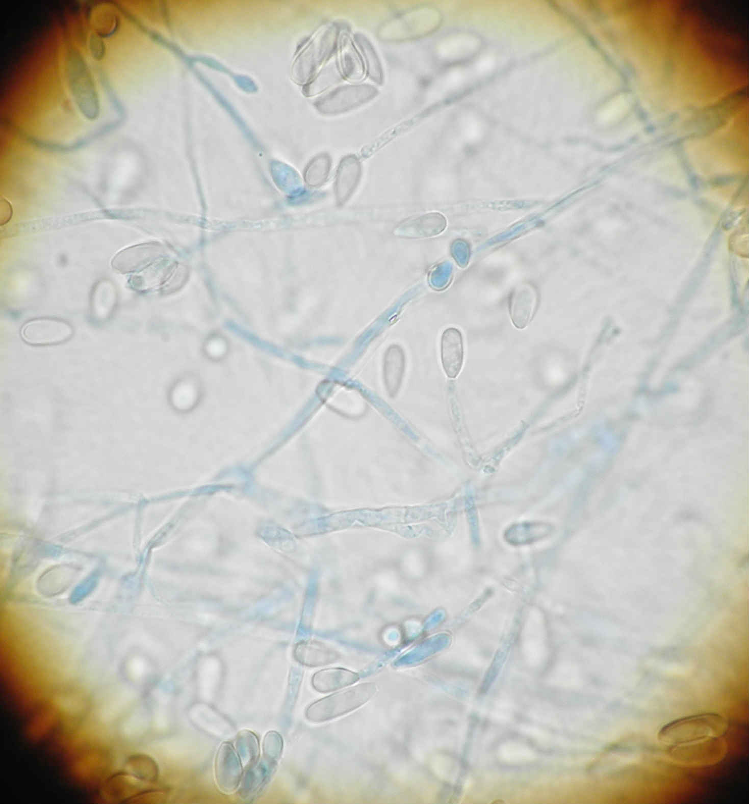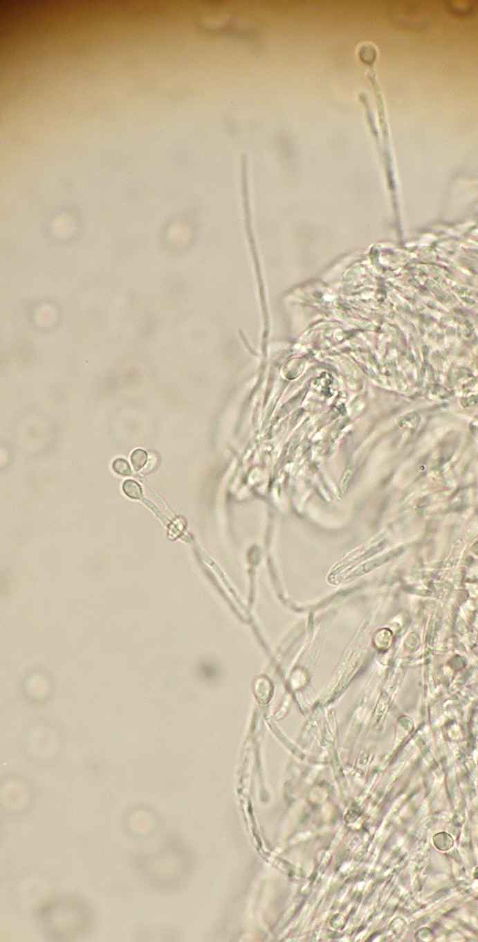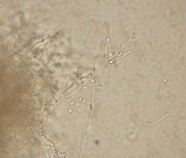Microscopicamente observam hifas hialinas septadas, conidioforo e conideos unicelulares ovais. |