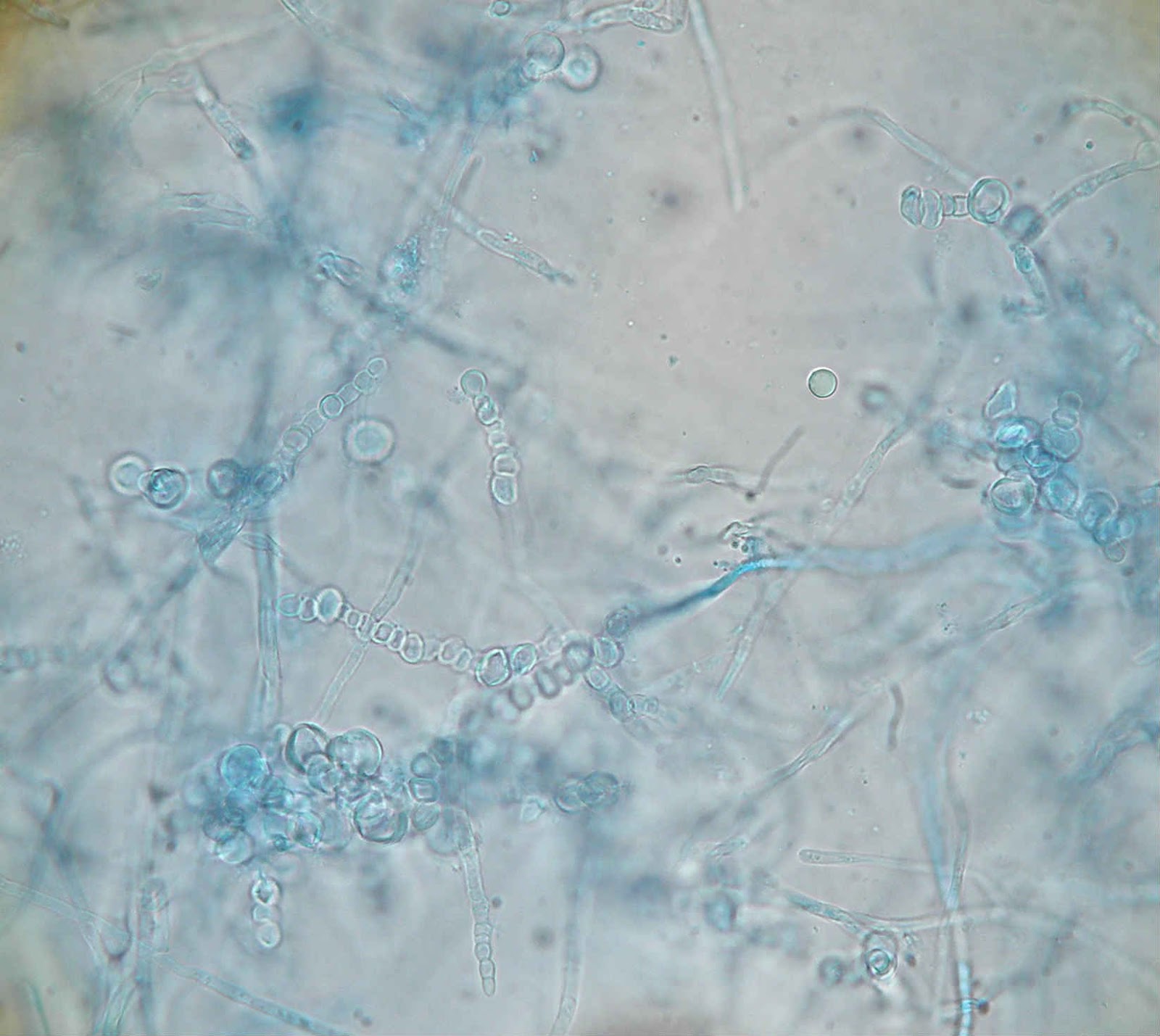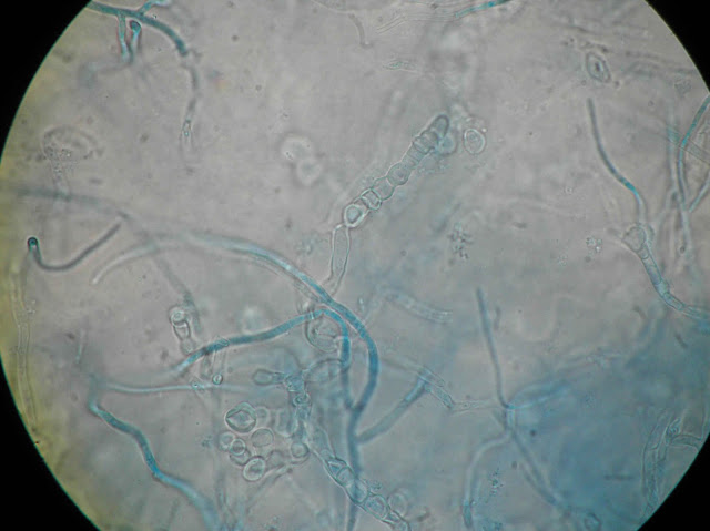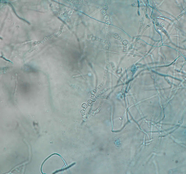 Ao exame microscópico observam hifas septadas de modo a apresentar artroconidios cilindricos ou elipsoides